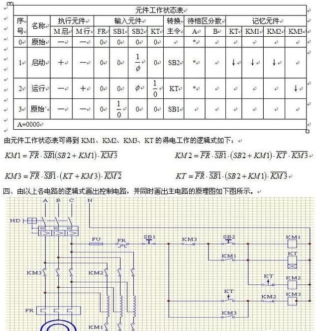 三、控制电路要做到KM1、KM2、KM3有序地投入和切除,就要做好控制电路的转换顺序。要用到的元件有:启动按钮一个;停止按钮一个;接触器KM1、KM2、KM3三个;延时用的时间继电器一个;电机过流热敏继电器一个。控制电路的工作程序有四步:原始状态;启动状态;运行状态;停止状态。由此可得到如下的元件工作状态表如下表所示。